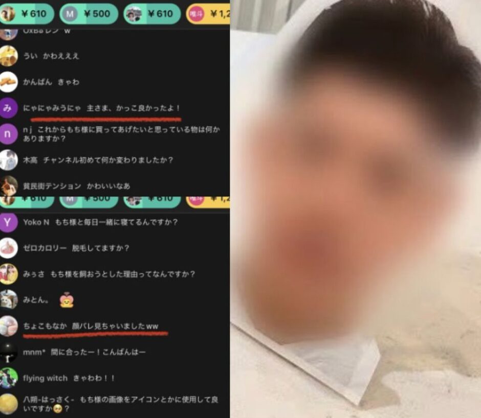 画像のように例え顔の一部でさえ顔バレしないようにモザイクをかけているので、相当自分の顔バレはしたくないんだと思いきや、過去に一度だけライブ配信にて顔が映り込んでしまったこともあったようです。